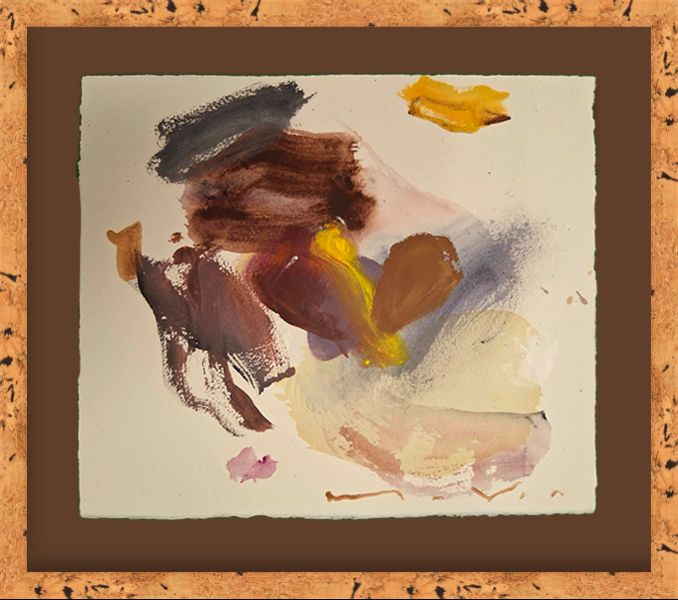 Details: This is a mixed-media painting on cream Rivers BFK 280 gsm paper, floated on a chocolate brown mat in a cork-wrapped frame with classic, high-quality UV 1/16” Plexi Glass.