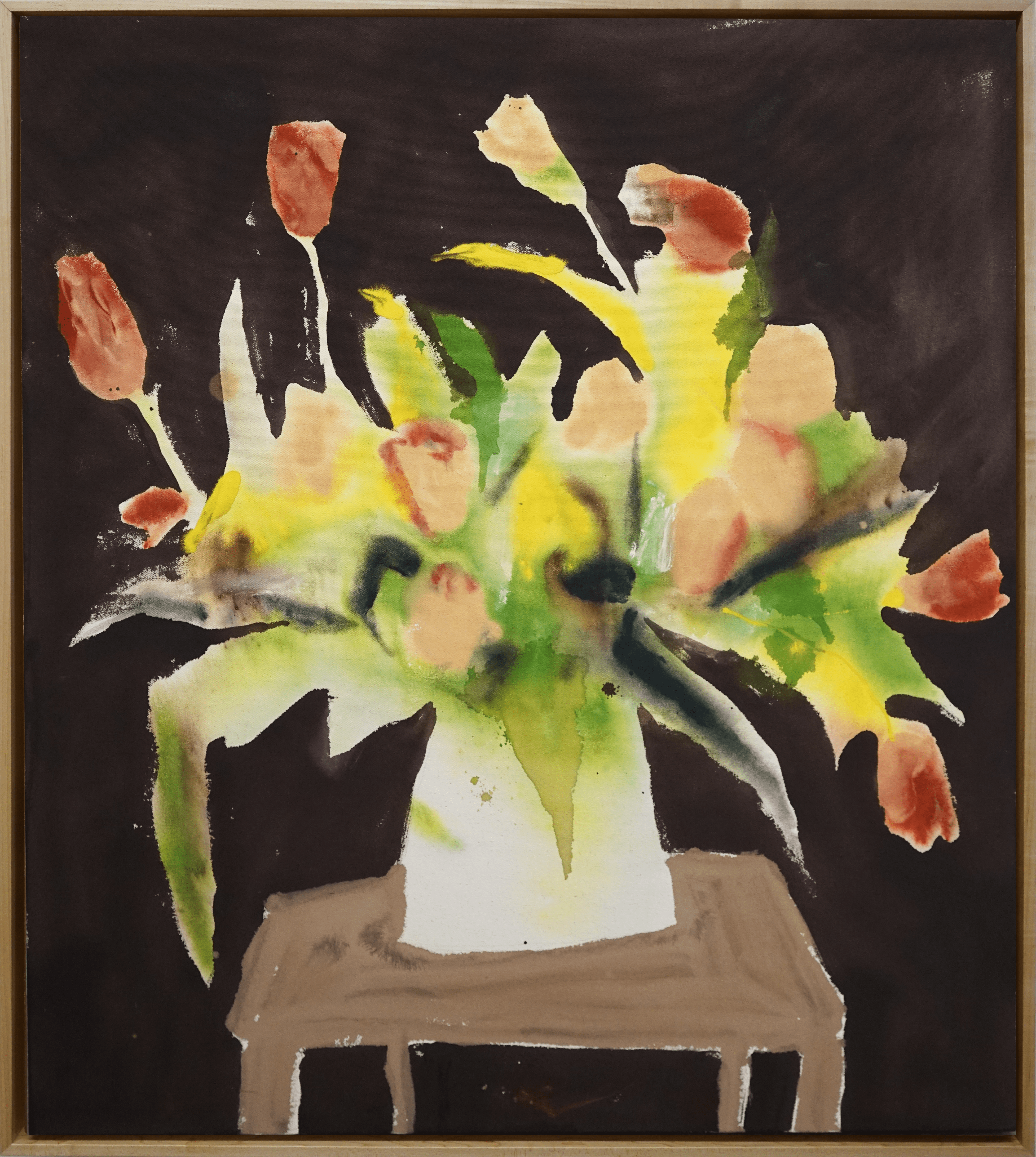 Details: This is a mixed media painting on a custom raw canvas panel framed in a maplewood floater frame.